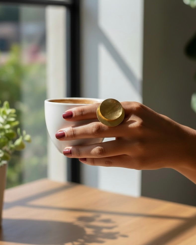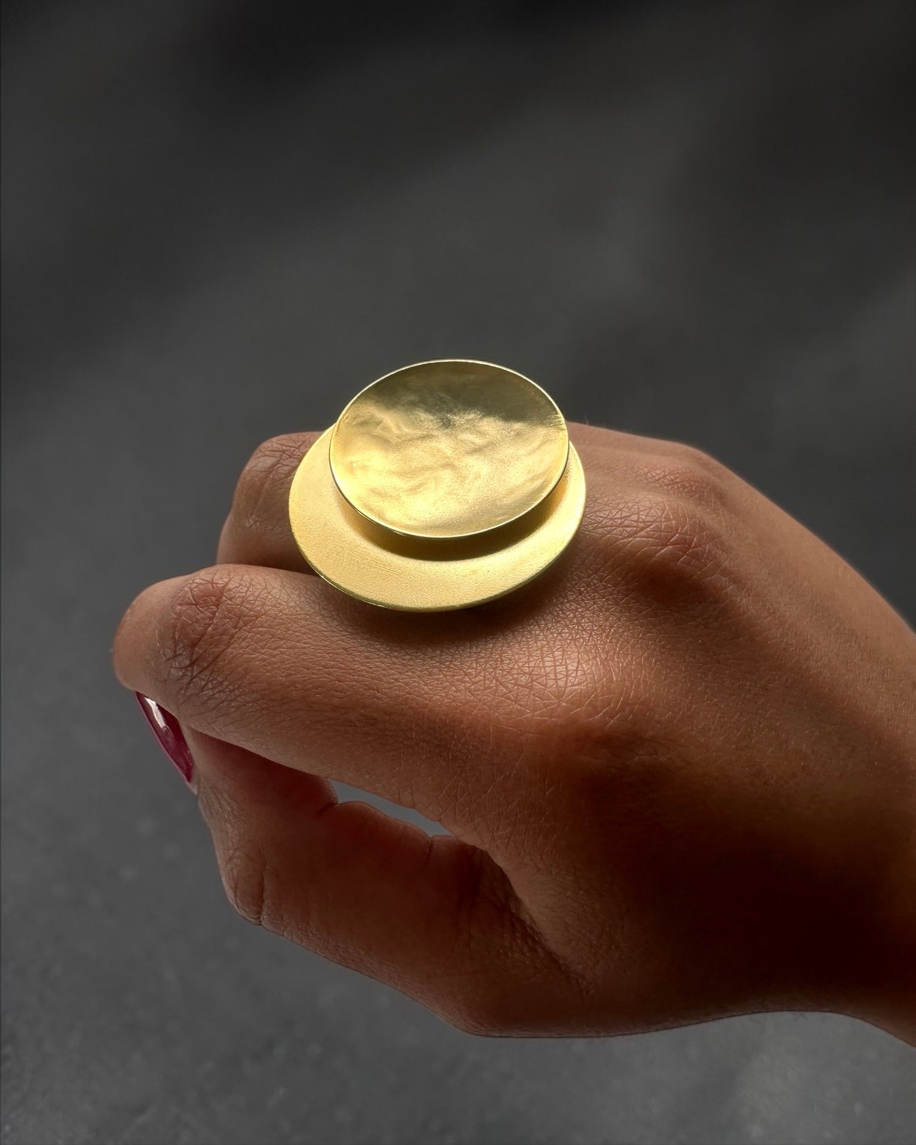 La bague Callista incarne avec audace l'élégance moderne et une féminité naturelle. Ornée de disques dorés délicatement sculptés et superposés, cette pièce d'exception capte et reflète la lumière avec grâce, créant un éclat subtil et radieux à chaque mouvement.